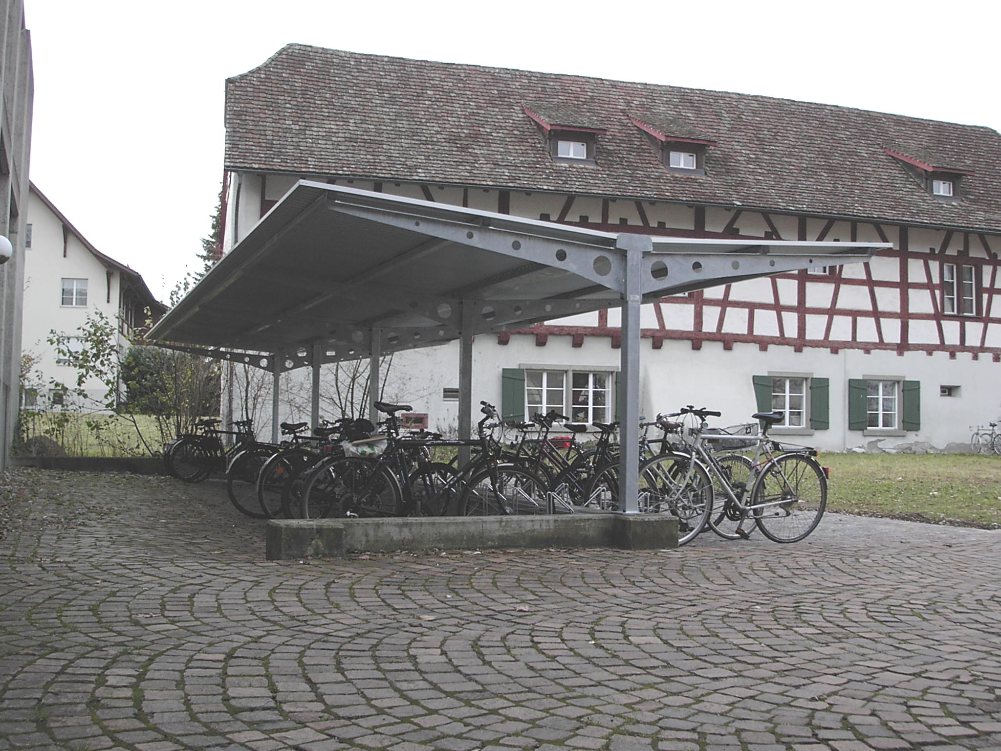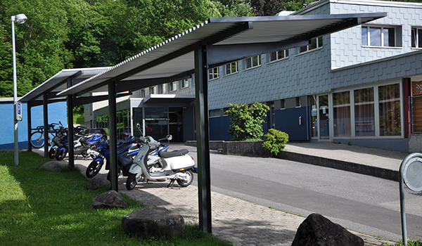 Schlichter funktionaler einseitig abgestützter Unterstand für das Unterstellen von Fahrräder und Mofas. Die Stützen, Querträgern und Tragarmen besteht aus verzinktem Stahl oder Edelstahl. Sie sind mit oder ohne Dekorationslöchern erhältlich. Sämtliche Überdachungsteile die Emissionen ausgesetzt sind, sind aus farblos eloxierten Aluminiumprofilen mit dem Patent "La Tettoia“ System gefertigt. Für die Eindeckung kann ausgewählt werden zwischen Aluminium-Trapezblech Platten, original Plexiglas® Röhm SDP Doppelstegplatten 16mm oder Verbundsicherheitsglas. Andere Masse oder Farben, Vorbereitung LED oder Sonderausführungen sind auf Anfrage möglich.